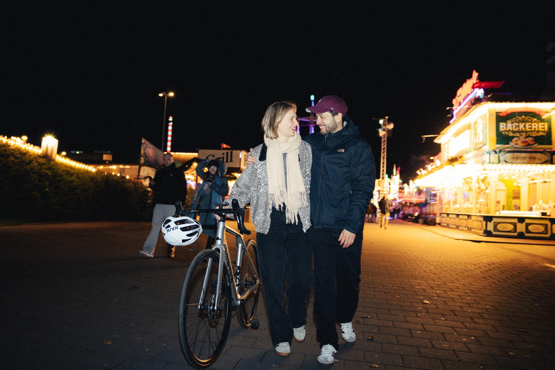 Paar geht nach Hause, im Hintergrund Lichter eines Jahrmarkts