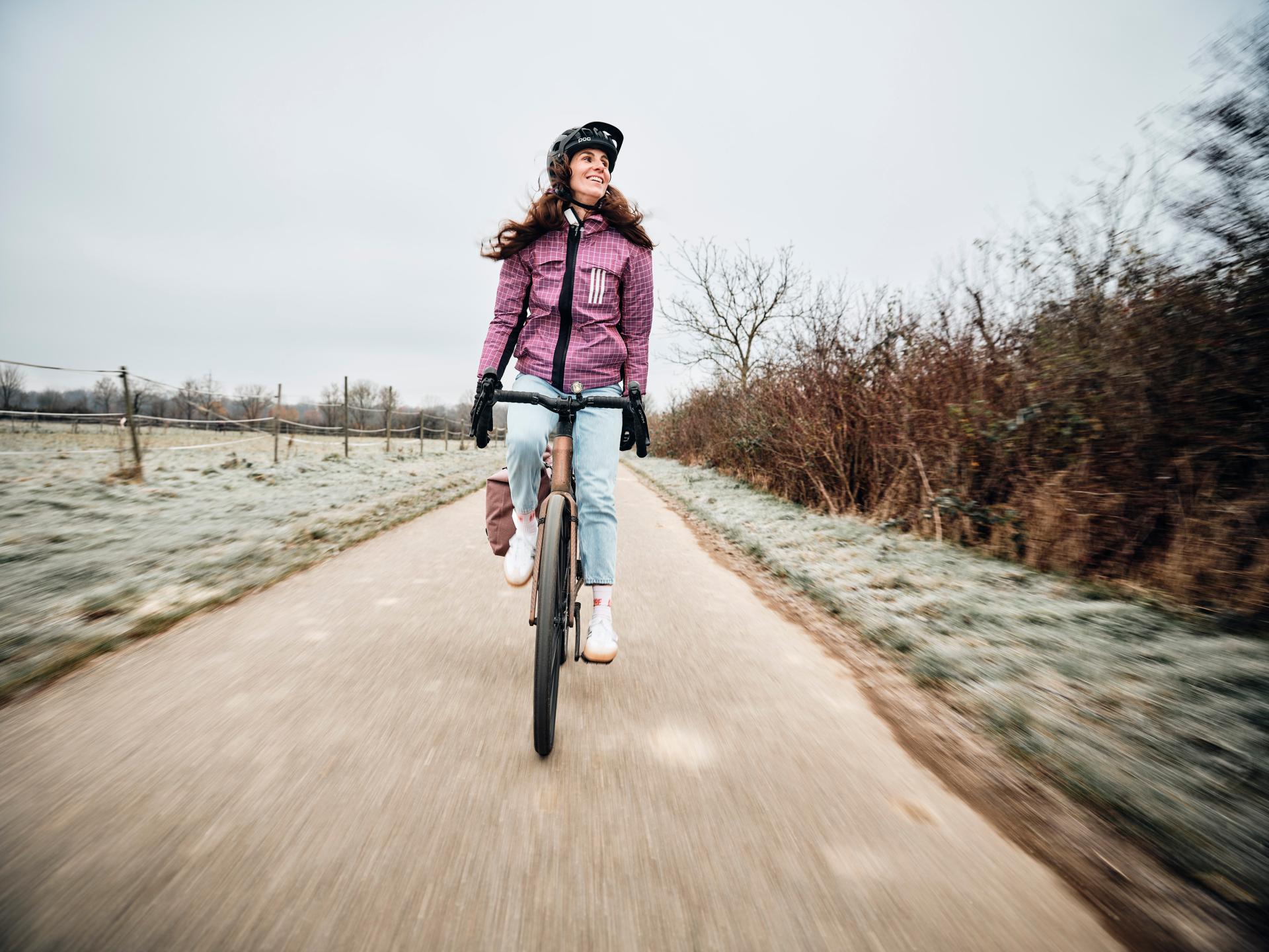 JobRadlerin fährt befreit und lächelnd einen Weg entlang im Herbst