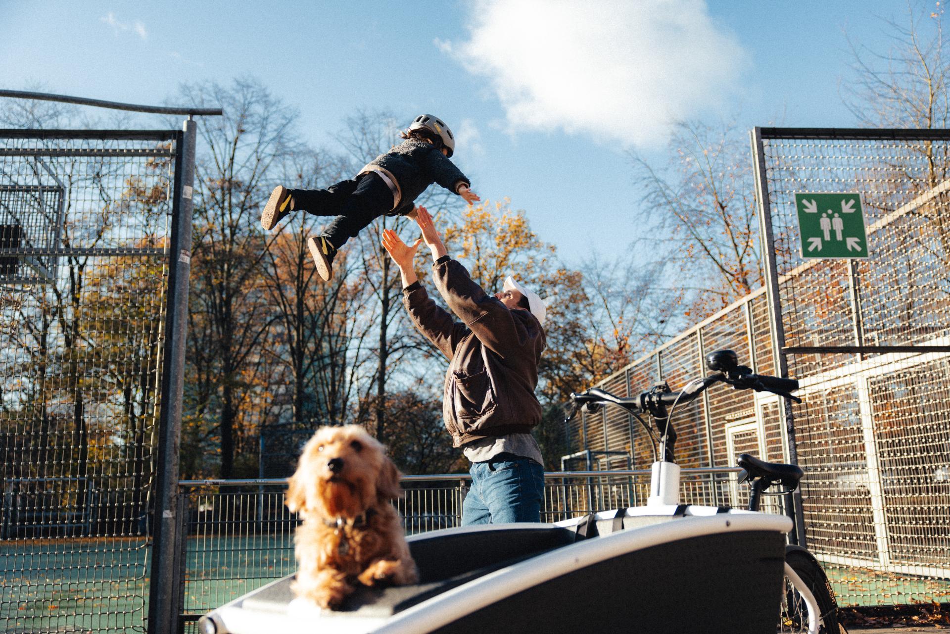 Vater wirft seinen Sohn in die Luft, im Vordergrund Hund